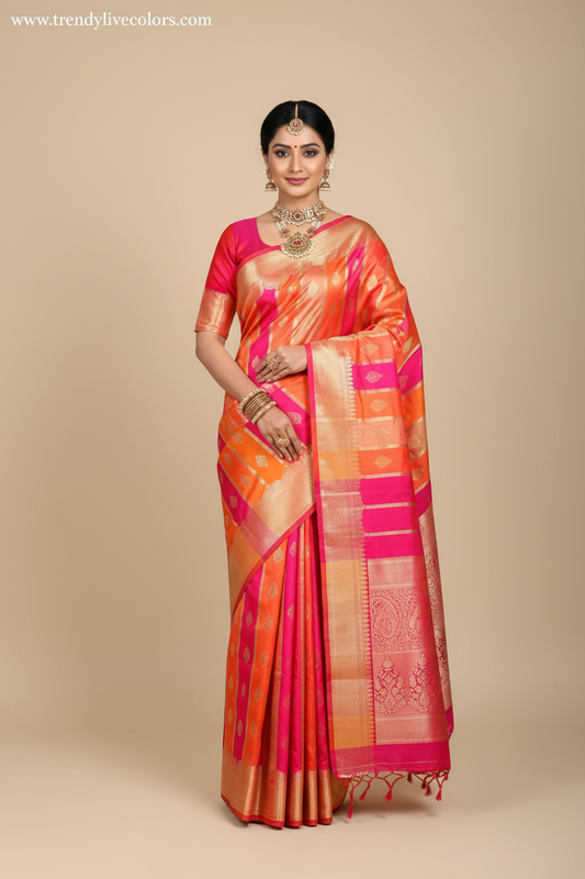 "Discover timeless elegance with our Banarasi Silk sarees, featuring beautiful Zari work. Luxurious, traditional, and perfect for weddings, these sarees add a touch of grandeur to your special day. Shop now for your dream elegant look!"