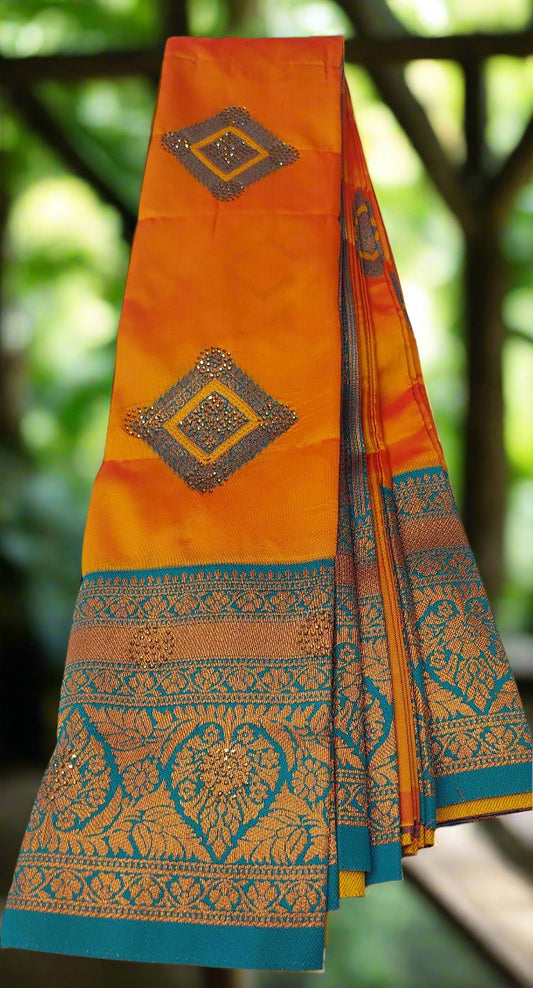 Kaveri pattu saree - Orange and Turquoise